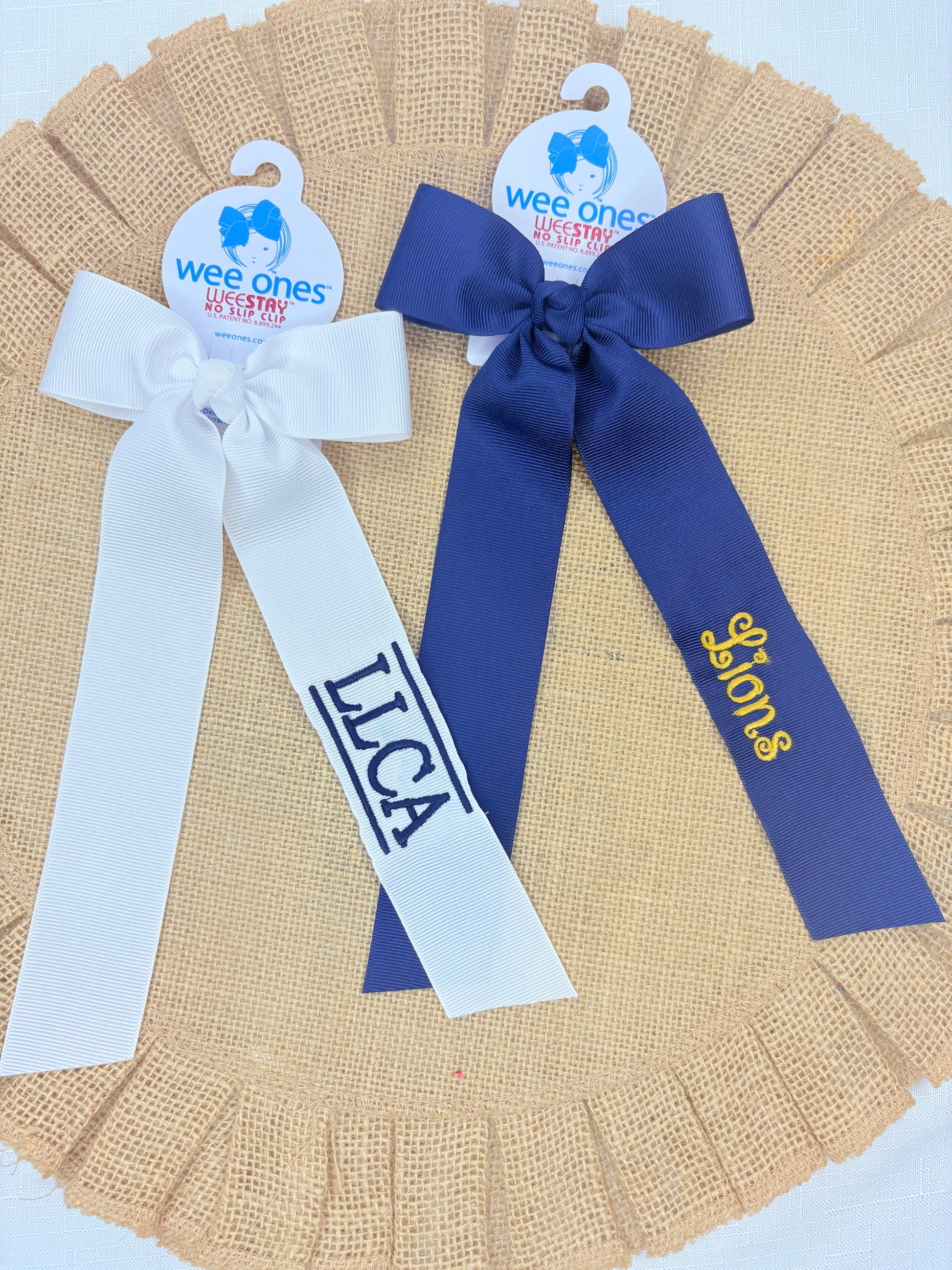 We're loving this hot new trend! Check out this adorable medium grosgrain bowtie with a knot wrap and 9" streamer tails. These bows are sure to stay in her hair all day with our patented WeeStay™ no-slip hair clip.